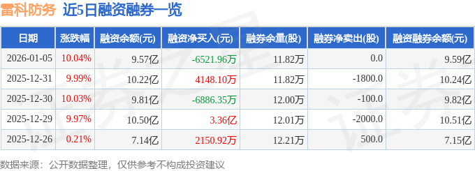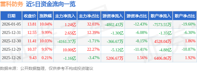 证券之星消息,截至2026年1月5日收盘,雷科防务(002413)报收于13.81元,上涨10.04%,已连续涨停4天,换手率2.16%,成交量27.98万手,成交额3.86亿元。