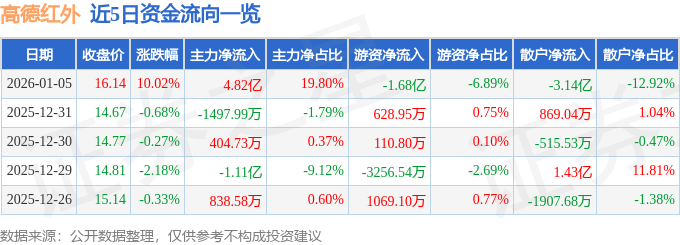 证券之星消息,截至2026年1月5日收盘,高德红外(002414)报收于16.14元,上涨10.02%,涨停,换手率4.61%,成交量156.73万手,成交额24.33亿元。