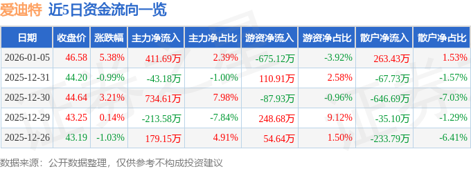 证券之星消息,截至2026年1月5日收盘,爱迪特(301580)报收于46.58元,上涨5.38%,换手率5.16%,成交量3.72万手,成交额1.72亿元。