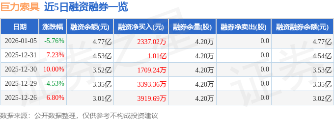 巨力索具融资融券信息显示,融资方面,当日融资买入1.47亿元,融资偿还1.24亿元,融资净买入2337.02万元,连续3日净买入累计1.41亿元。融券方面,融券卖出0.0股,融券偿还0.0股,融券余量4.2万股,融券余额36.41万元。融资融券余额4.77亿元。