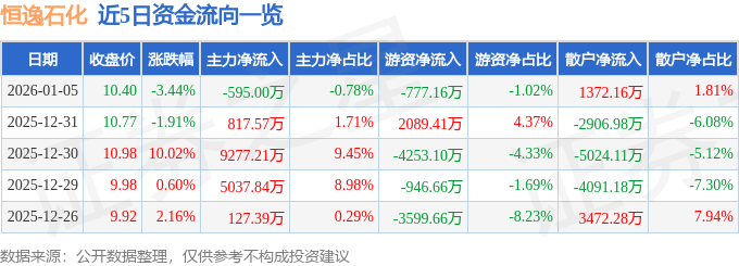 证券之星消息,截至2026年1月5日收盘,恒逸石化(000703)报收于10.4元,下跌3.44%,换手率2.05%,成交量73.54万手,成交额7.6亿元。