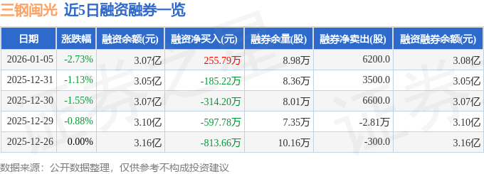 三钢闽光融资融券信息显示,融资方面,当日融资买入1490.74万元,融资偿还1234.94万元,融资净买入255.79万元。融券方面,融券卖出6600.0股,融券偿还400.0股,融券余量8.98万股,融券余额38.34万元。融资融券余额3.08亿元。