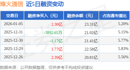 证券之星消息,1月5日,烽火通信(600498)融资买入7.02亿元,融资偿还4.73亿元,融资净买入2.3亿元,融资余额23.31亿元,当日融资净买入排名第16,近20个交易日中有11个交易日出现融资净买入。