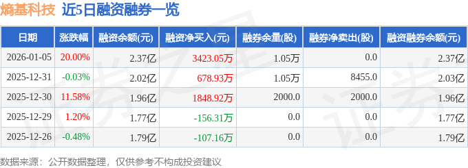 证券之星消息,截至2026年1月5日收盘,熵基科技(301330)报收于39.66元,上涨20.0%,涨停,换手率17.61%,成交量20.06万手,成交额7.76亿元。