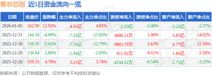 证券之星消息,截至2026年1月5日收盘,香农芯创(300475)报收于162.99元,上涨12.92%,换手率13.28%,成交量59.15万手,成交额93.8亿元。