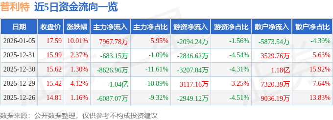 证券之星消息,截至2026年1月5日收盘,普利特(002324)报收于17.59元,上涨10.01%,涨停,换手率10.09%,成交量78.29万手,成交额13.39亿元。