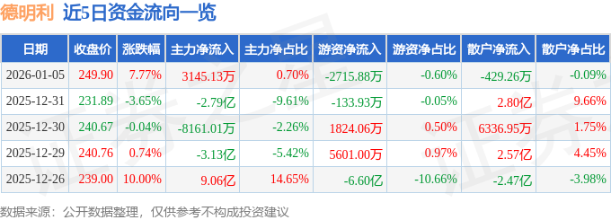 1月5日的资金流向数据方面,主力资金净流入3145.13万元,占总成交额0.7%,游资资金净流出2715.88万元,占总成交额0.6%,散户资金净流出429.26万元,占总成交额0.09%。