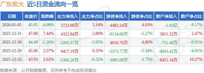 证券之星消息,截至2026年1月5日收盘,广东宏大(002683)报收于45.85元,下跌4.08%,换手率3.63%,成交量24.13万手,成交额11.13亿元。