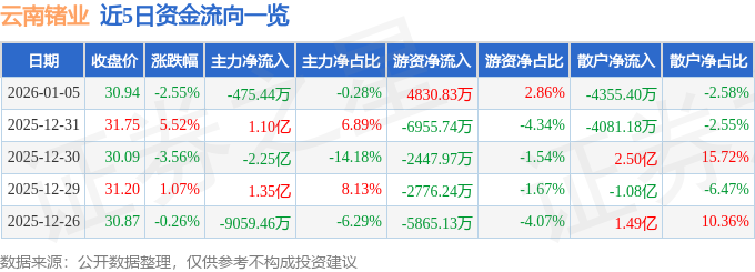 证券之星消息,截至2026年1月5日收盘,云南锗业(002428)报收于30.94元,下跌2.55%,换手率8.31%,成交量54.28万手,成交额16.87亿元。