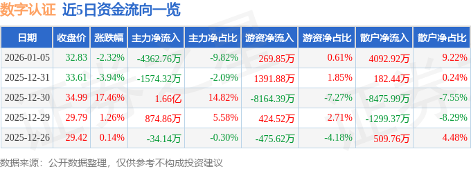 证券之星消息,截至2026年1月5日收盘,数字认证(300579)报收于32.83元,下跌2.32%,换手率5.17%,成交量13.56万手,成交额4.44亿元。