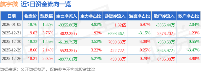 1月5日的资金流向数据方面,主力资金净流出9355.86万元,占总成交额4.93%,游资资金净流入1.32亿元,占总成交额6.97%,散户资金净流出3866.44万元,占总成交额2.04%。