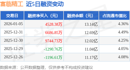 证券之星消息,1月5日,富临精工(300432)融资买入2.69亿元,融资偿还2.24亿元,融资净买入4528.38万元,融资余额13.14亿元,近3个交易日已连续净买入累计2.1亿元。