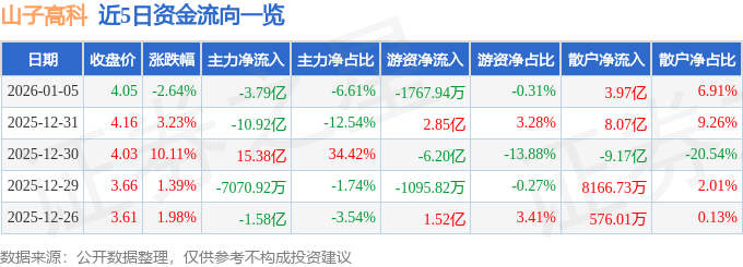 1月5日的资金流向数据方面,主力资金净流出3.79亿元,占总成交额6.61%,游资资金净流出1767.94万元,占总成交额0.31%,散户资金净流入3.97亿元,占总成交额6.91%。