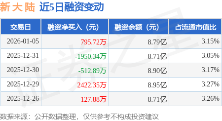 证券之星消息,1月5日,新 大 陆(000997)融资买入8681.59万元,融资偿还7885.87万元,融资净买入795.72万元,融资余额8.79亿元。