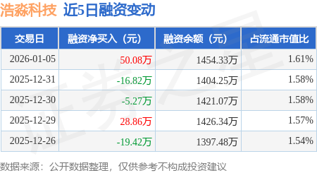 证券之星消息,1月5日,浩淼科技(920856)融资买入197.97万元,融资偿还147.89万元,融资净买入50.08万元,融资余额1454.33万元。