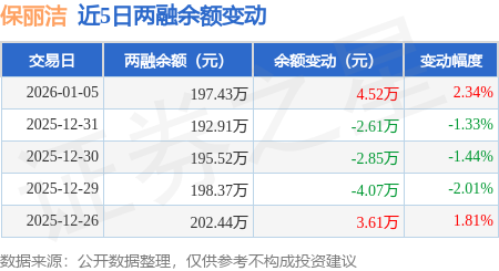 证券之星消息,1月5日,保丽洁(920802)融资买入14.84万元,融资偿还10.32万元,融资净买入4.52万元,融资余额197.43万元。