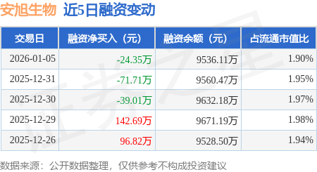 证券之星消息,1月5日,安旭生物(688075)融资买入431.91万元,融资偿还456.27万元,融资净卖出24.35万元,融资余额9536.11万元。