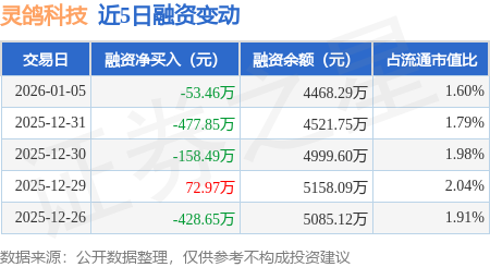 证券之星消息,1月5日,灵鸽科技(920284)融资买入501.1万元,融资偿还554.56万元,融资净卖出53.46万元,融资余额4468.29万元,近20个交易日中有12个交易日出现融资净买入。