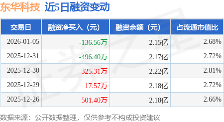 证券之星消息,1月5日,东华科技(002140)融资买入1186.07万元,融资偿还1322.63万元,融资净卖出136.56万元,融资余额2.15亿元。