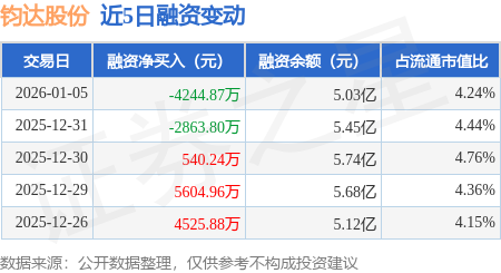 证券之星消息,1月5日,钧达股份(002865)融资买入1.31亿元,融资偿还1.73亿元,融资净卖出4244.87万元,融资余额5.03亿元。