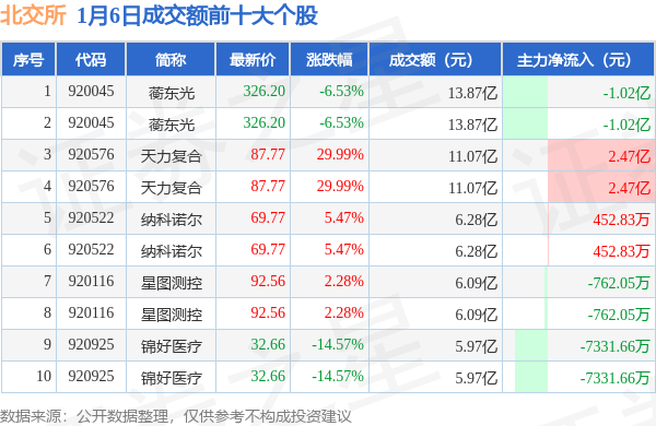 当日北交所成交额前10大个股中6只个股收涨,平均涨幅12.58%,其中蘅东光(920045)以成交额13.87亿元排第一。从主力资金流入看,成交额前10大个股中有4只个股呈现主力资金净流入。