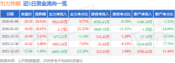证券之星消息,截至2026年1月6日收盘,引力传媒(603598)报收于20.56元,上涨10.01%,已连续涨停2天,换手率18.86%,成交量50.78万手,成交额10.2亿元。