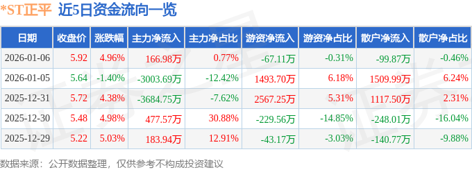 证券之星消息,截至2026年1月6日收盘,*ST正平(603843)报收于5.92元,上涨4.96%,换手率5.37%,成交量37.6万手,成交额2.16亿元。