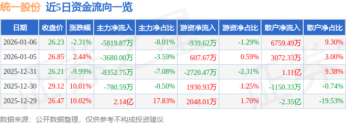 证券之星消息,截至2026年1月6日收盘,统一股份(600506)报收于26.23元,下跌2.31%,换手率14.33%,成交量27.52万手,成交额7.27亿元。