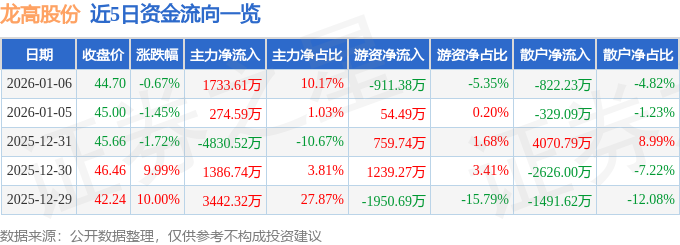 证券之星消息,截至2026年1月6日收盘,龙高股份(605086)报收于44.7元,下跌0.67%,换手率2.13%,成交量3.81万手,成交额1.7亿元。