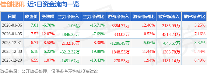 证券之星消息,截至2026年1月6日收盘,佳创视讯(300264)报收于7.01元,下跌6.78%,换手率25.09%,成交量92.93万手,成交额6.73亿元。