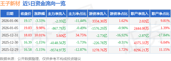 证券之星消息,截至2026年1月6日收盘,王子新材(002735)报收于19.17元,下跌3.33%,换手率38.35%,成交量107.56万手,成交额20.56亿元。