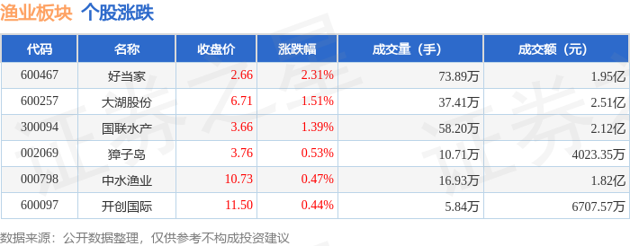 证券之星消息,1月6日渔业板块较上一交易日上涨1.16%,好当家领涨。当日上证指数报收于4083.67,上涨1.5%。深证成指报收于14022.55,上涨1.4%。渔业板块个股涨跌见下表: