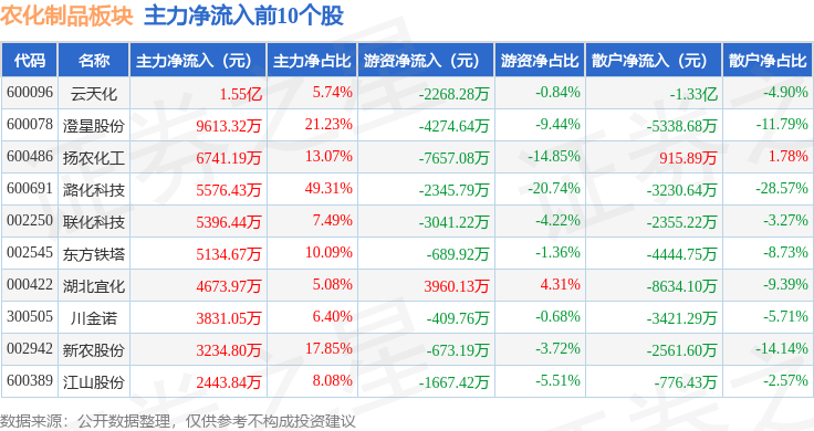 从资金流向上来看,当日农化制品板块主力资金净流入536.54万元,游资资金净流入4284.22万元,散户资金净流出4820.77万元。农化制品板块个股资金流向见下表: