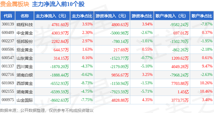 从资金流向上来看,当日贵金属板块主力资金净流出3.29亿元,游资资金净流入1513.62万元,散户资金净流入3.13亿元。贵金属板块个股资金流向见下表: