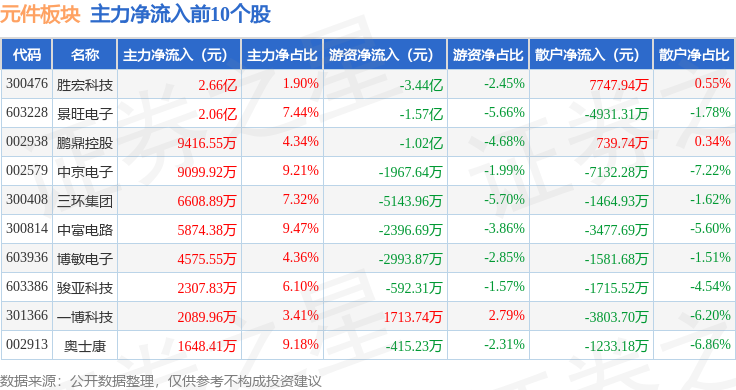 从资金流向上来看,当日元件板块主力资金净流出16.88亿元,游资资金净流出1.79亿元,散户资金净流入18.67亿元。元件板块个股资金流向见下表: