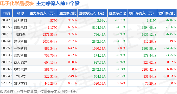 从资金流向上来看,当日电子化学品板块主力资金净流出2.4亿元,游资资金净流出3.23亿元,散户资金净流入5.63亿元。电子化学品板块个股资金流向见下表:
