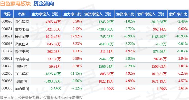 从资金流向上来看,当日白色家电板块主力资金净流出2.01亿元,游资资金净流入6132.02万元,散户资金净流入1.4亿元。白色家电板块个股资金流向见下表: