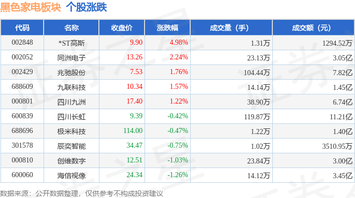 证券之星消息,1月6日黑色家电板块较上一交易日上涨0.23%,*ST高斯领涨。当日上证指数报收于4083.67,上涨1.5%。深证成指报收于14022.55,上涨1.4%。黑色家电板块个股涨跌见下表: