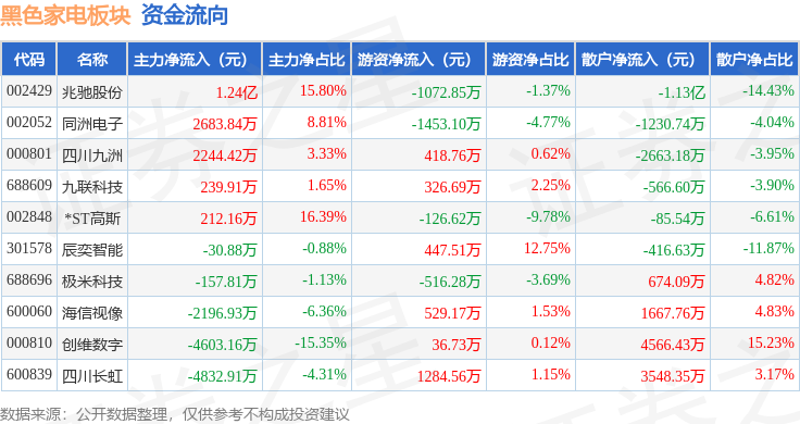 从资金流向上来看,当日黑色家电板块主力资金净流入5914.51万元,游资资金净流出125.43万元,散户资金净流出5789.08万元。黑色家电板块个股资金流向见下表: