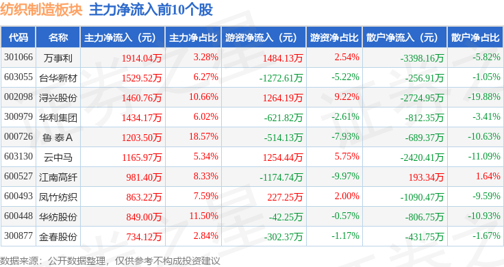 从资金流向上来看,当日纺织制造板块主力资金净流入7226.57万元,游资资金净流入5902.54万元,散户资金净流出1.31亿元。纺织制造板块个股资金流向见下表: