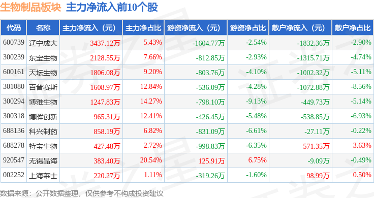 从资金流向上来看,当日生物制品板块主力资金净流出4.26亿元,游资资金净流入1.04亿元,散户资金净流入3.23亿元。生物制品板块个股资金流向见下表: