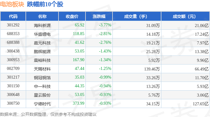 从资金流向上来看,当日电池板块主力资金净流出20.87亿元,游资资金净流入8.25亿元,散户资金净流入12.62亿元。电池板块个股资金流向见下表: