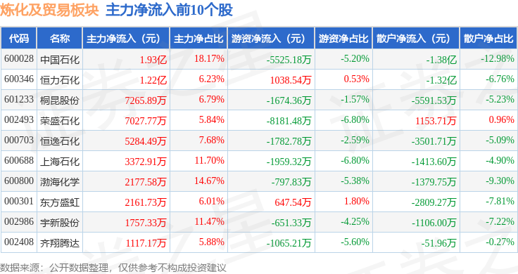 从资金流向上来看,当日炼化及贸易板块主力资金净流入4.08亿元,游资资金净流出2587.49万元,散户资金净流出3.82亿元。炼化及贸易板块个股资金流向见下表: