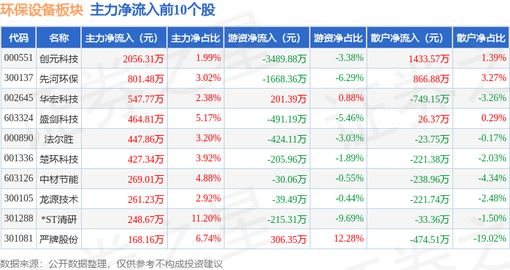 从资金流向上来看,当日环保设备板块主力资金净流出7546.6万元,游资资金净流出2769.25万元,散户资金净流入1.03亿元。环保设备板块个股资金流向见下表: