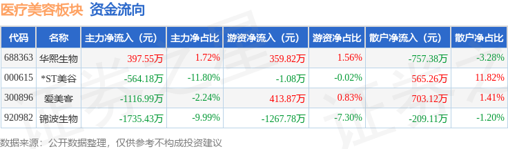 从资金流向上来看,当日医疗美容板块主力资金净流出1283.62万元,游资资金净流入772.62万元,散户资金净流入511.0万元。医疗美容板块个股资金流向见下表: