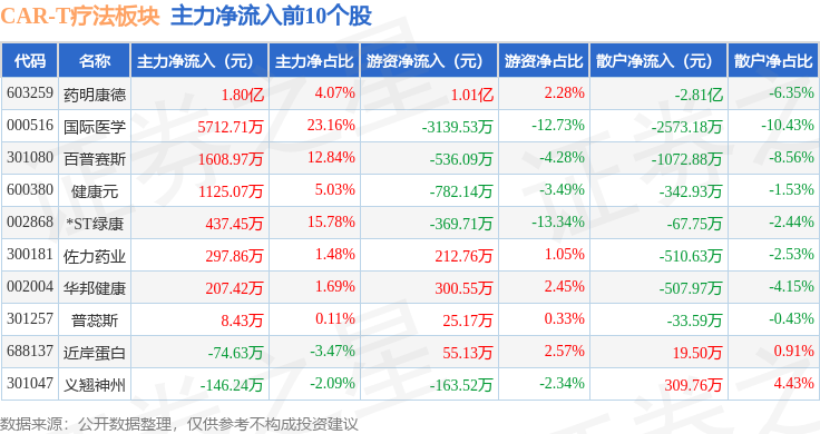 从资金流向上来看,当日CAR-T疗法板块主力资金净流出3.12亿元,游资资金净流入7007.1万元,散户资金净流入2.42亿元。CAR-T疗法板块个股资金流向见下表: