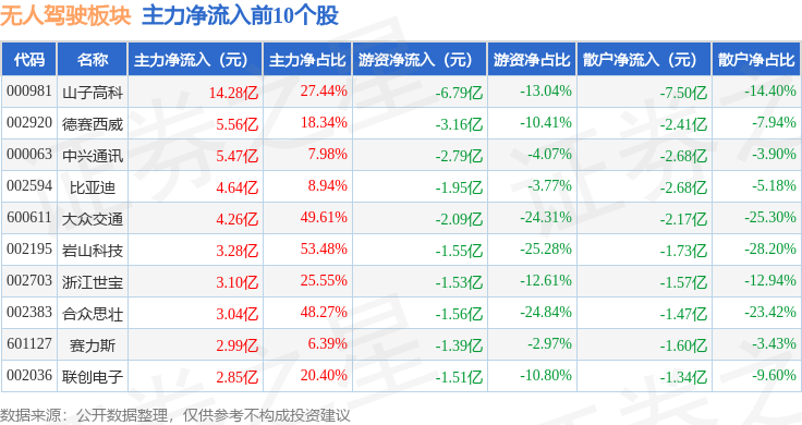 从资金流向上来看,当日无人驾驶板块主力资金净流入35.75亿元,游资资金净流出37.19亿元,散户资金净流入1.44亿元。无人驾驶板块个股资金流向见下表: