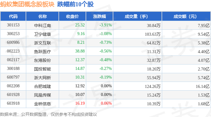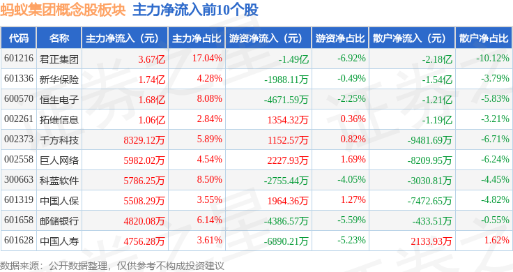 从资金流向上来看,当日蚂蚁集团概念股板块主力资金净流入4.18亿元,游资资金净流出5.29亿元,散户资金净流入1.11亿元。蚂蚁集团概念股板块个股资金流向见下表:
