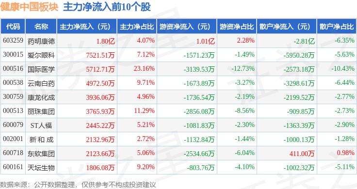 从资金流向上来看,当日健康中国板块主力资金净流出15.46亿元,游资资金净流入2.46亿元,散户资金净流入12.99亿元。健康中国板块个股资金流向见下表:
