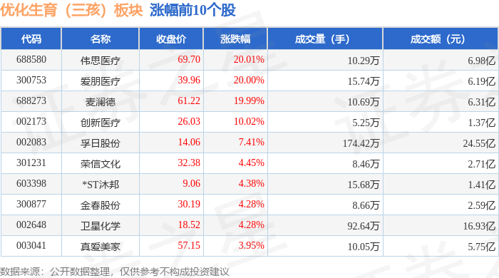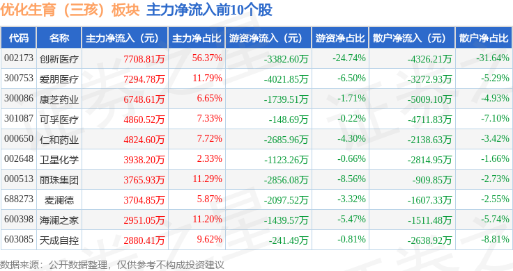 从资金流向上来看,当日优化生育(三孩)板块主力资金净流出8.67亿元,游资资金净流入1.75亿元,散户资金净流入6.93亿元。优化生育(三孩)板块个股资金流向见下表: